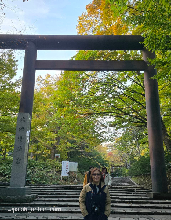 Dari Otaru, perjalanan berlanjut ke Hokkaido Jingu Shrine, kuil megah yang terletak di dalam Taman Maruyama. Musim gugur membuat tempat ini semakin indah dengan dedaunan jingga keemasan. Satu jam di sini terasa kurang untuk menikmati ketenangan dan keanggunannya.